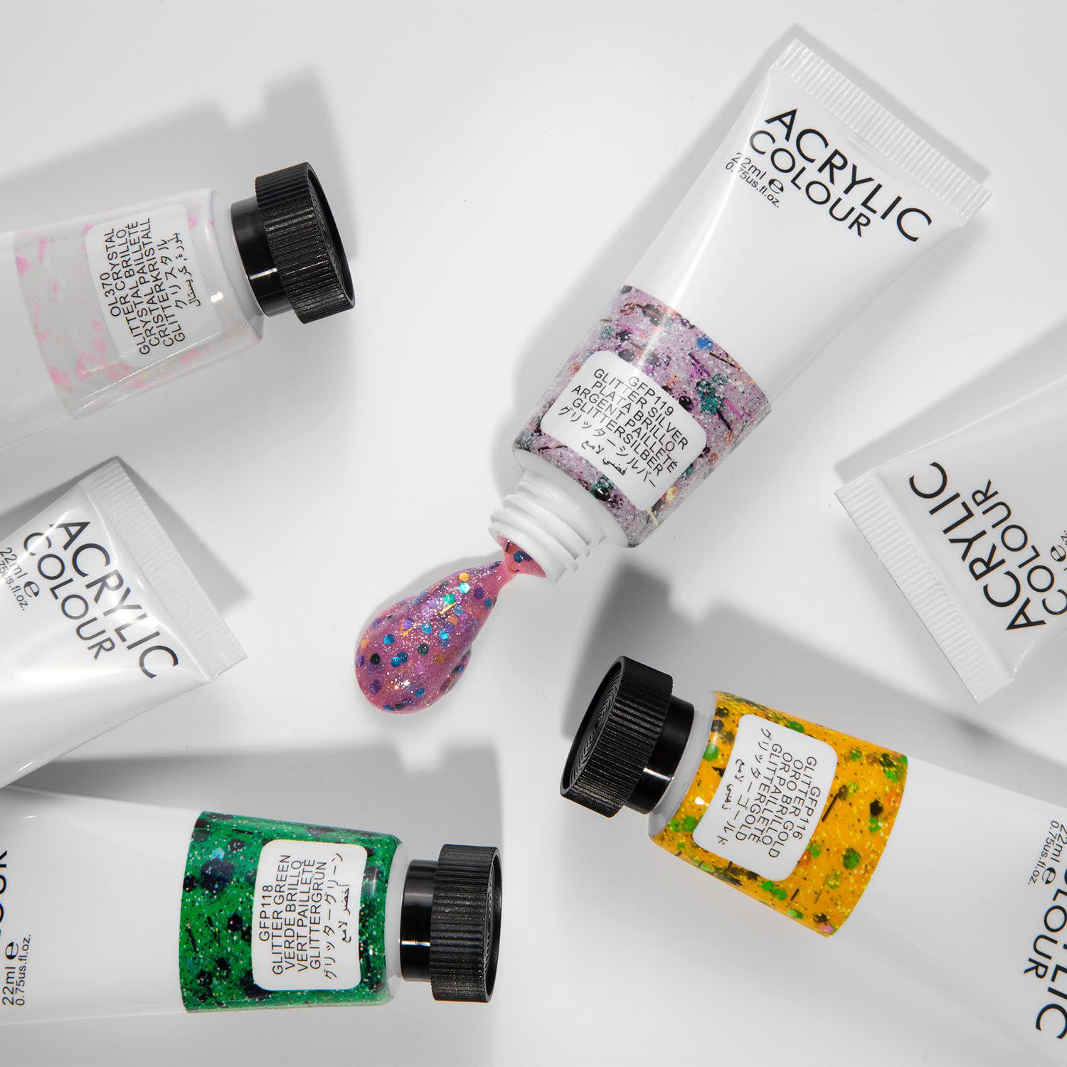Παίξε με τα ακρυλικά χρώματα σε 8 αποχρώσεις με glitter και δημιούργησε μοναδικά… έργα τέχνης. Είναι υψηλής φωτεινότητας και καλυπτικότητας και είναι ιδανικά για να ζωγραφίσεις σε οποιαδήποτε επιφάνεια. Έχουν χωρητικότητα 22ml και για την μέγιστη απόδοση μην ξεχάσεις να τα αραιώσεις με νερό.